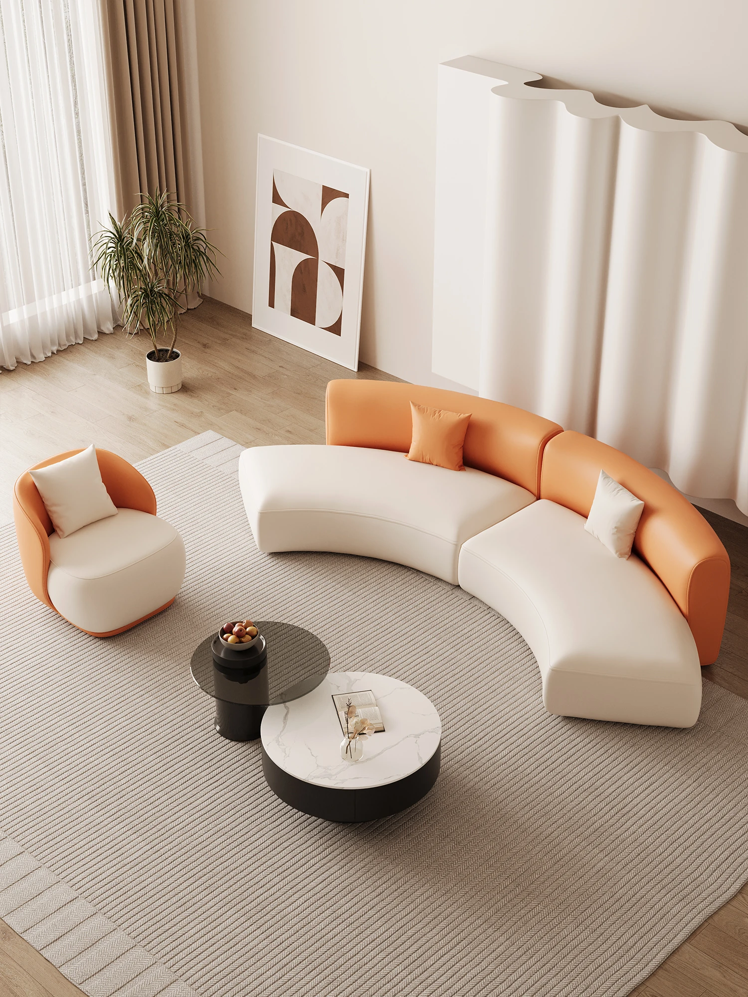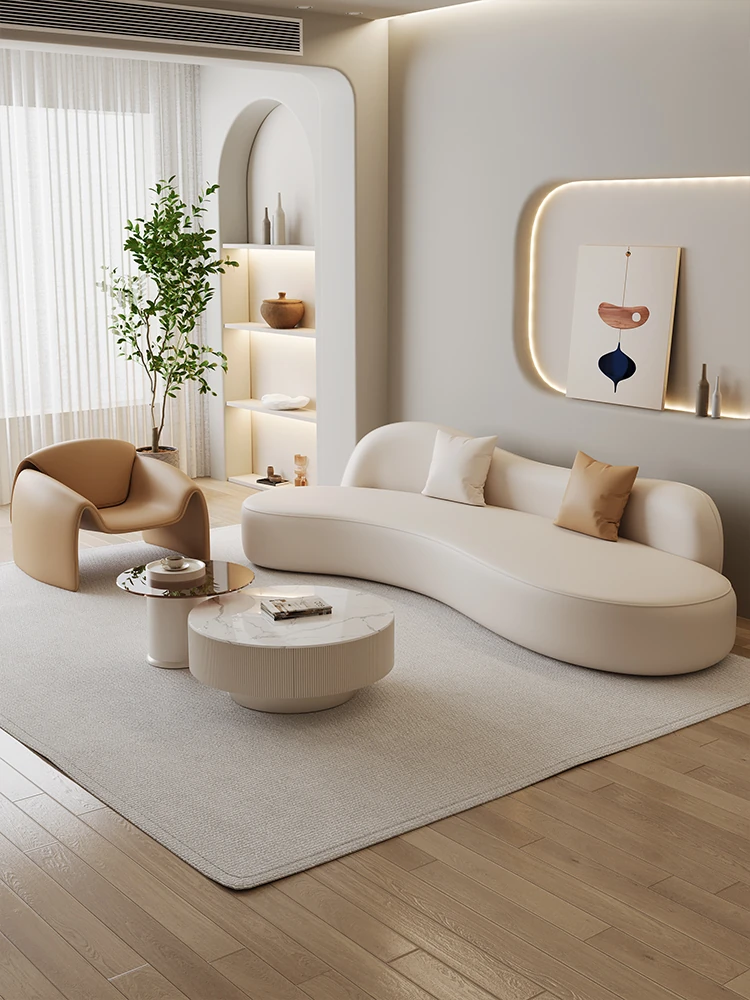 曲線デザインのソファー - 小型リビングに最適!クリーミーな風合いで、美容院やアパート、民宿の休憩エリアにぴったり。おしゃれな接客スペースや商談にも最適なテーブル付きで、心地よい空間を演出します。