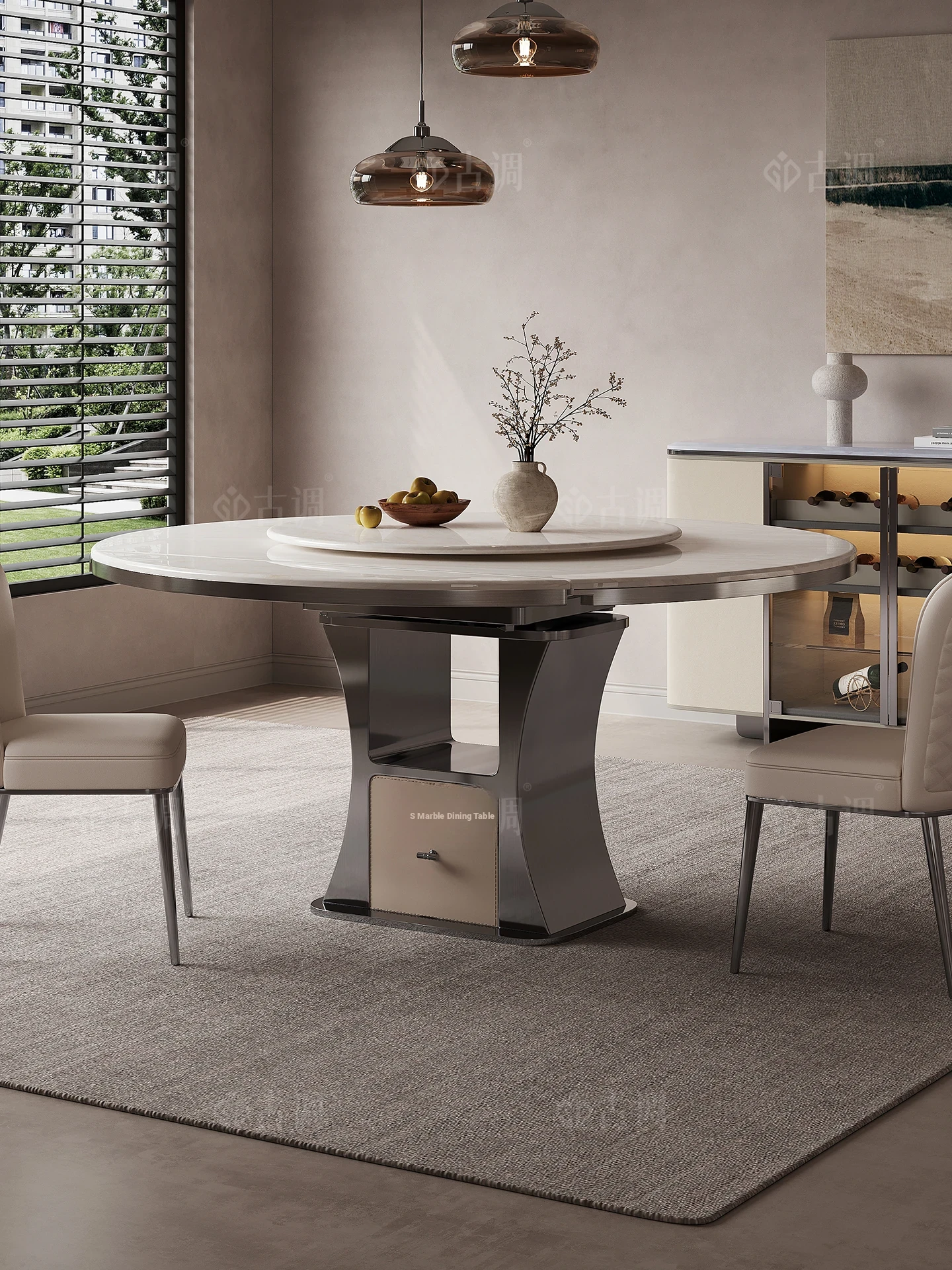 Elegant Round Marble Dining Table - Adjustable, Space-Saving, and Luxurious Design for Modern Homes. Perfect for Family Meals and Entertaining Guests.