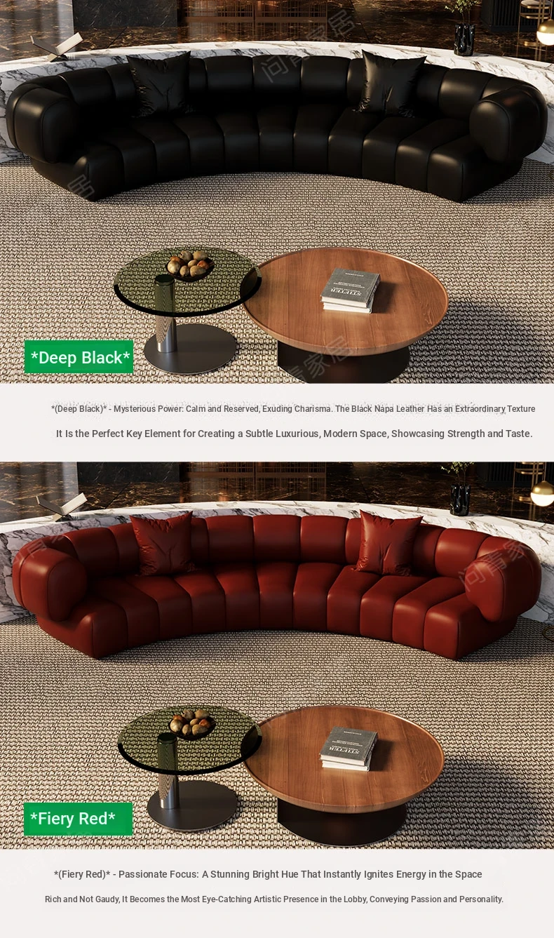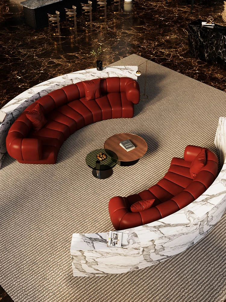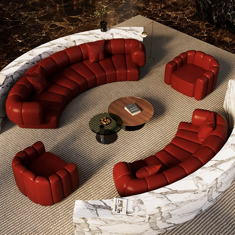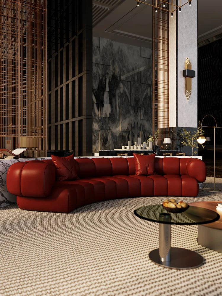 Curved Red Accent Sofa - Unique Half-Moon Design for Reception Areas, Offices, Showrooms, and Hotel Lobbies - Perfect for Comfortable Conversations and Stylish Waiting Spaces