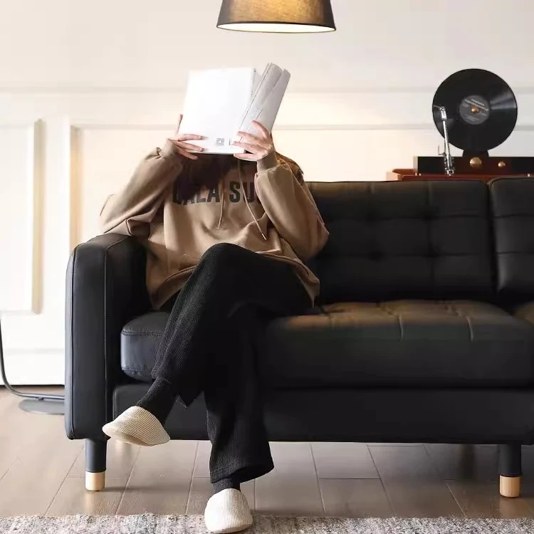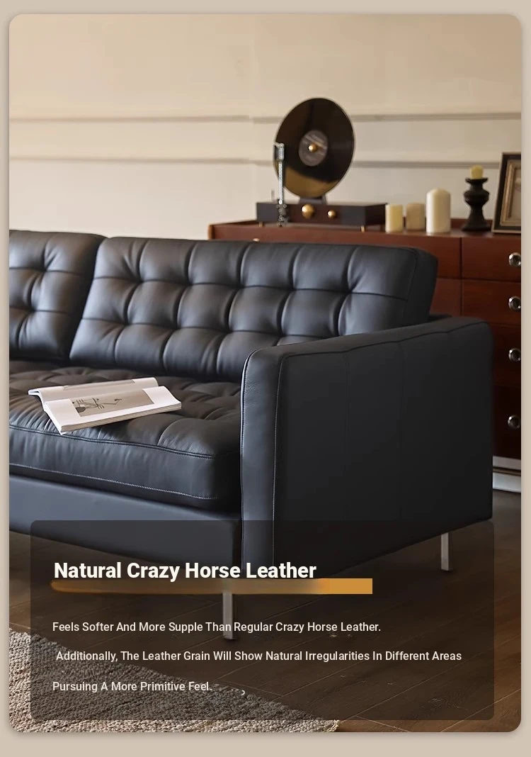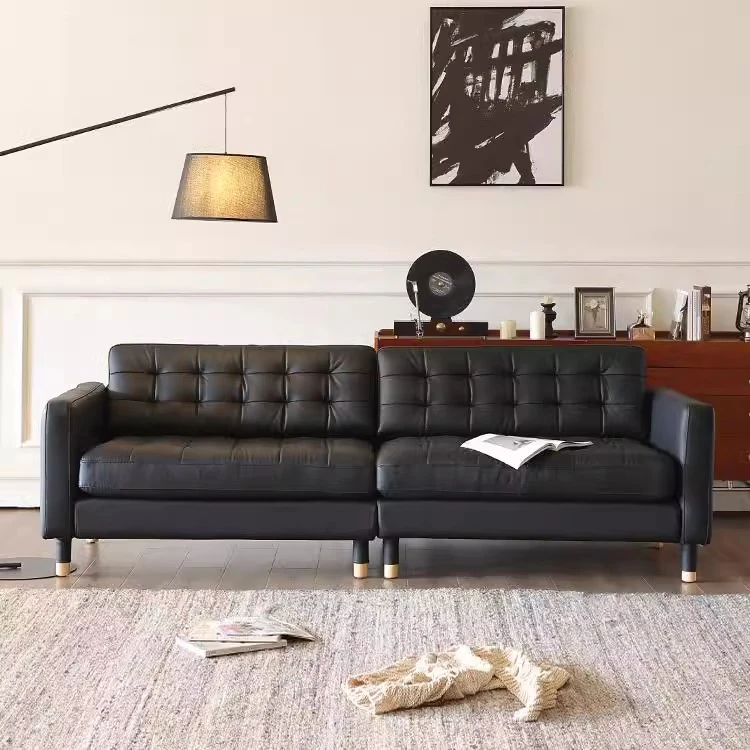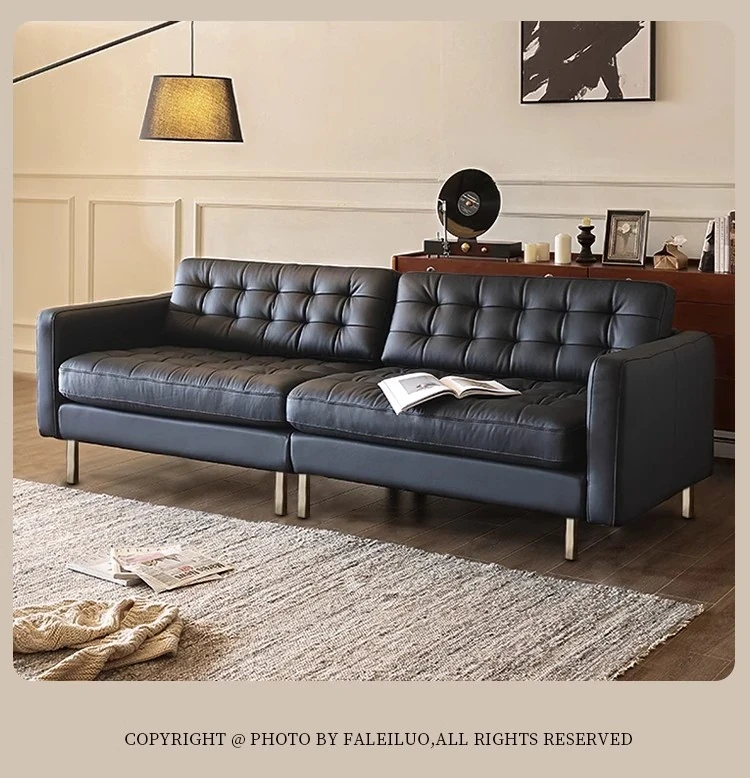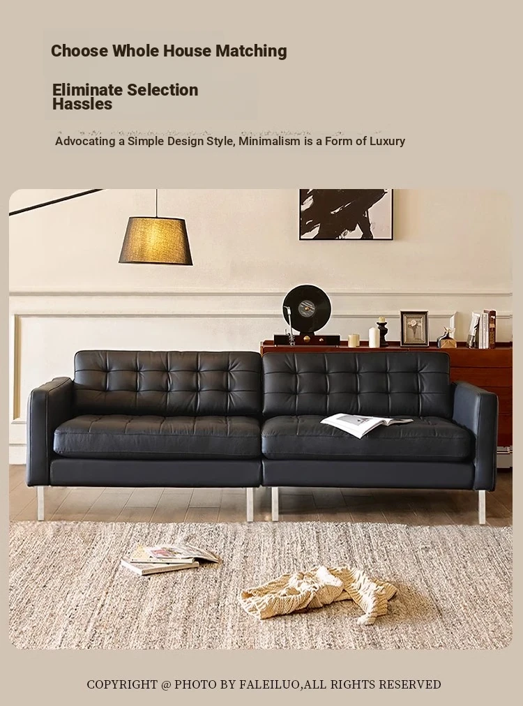 2025 New Vintage French Genuine Leather Sofa - Modern Minimalist Landekna Straight Black Mid-Century Living Room Couch