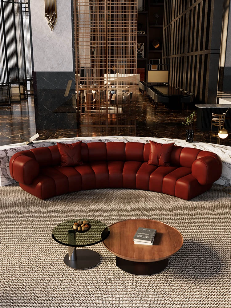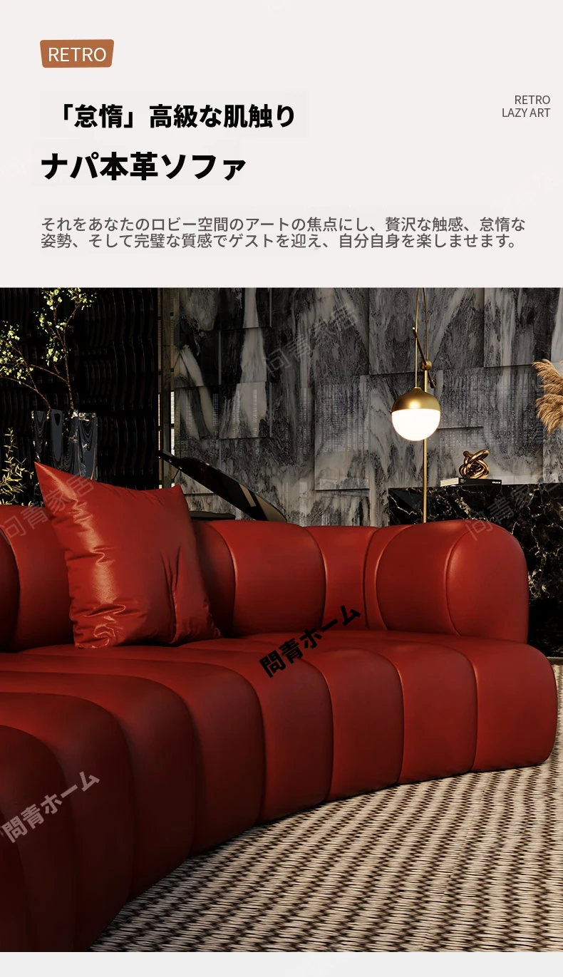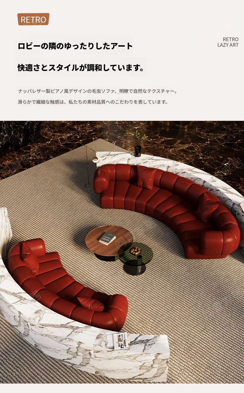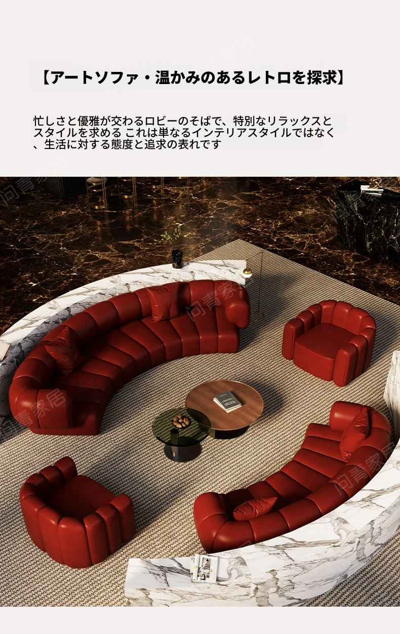 魅力的ハーフアーチソファー、ユニークなワインレッドカラー!オフィス、ショールーム、ホテルロビーに最適なリラックス空間を演出。お客様を魅了する接客エリアにぴったりです!