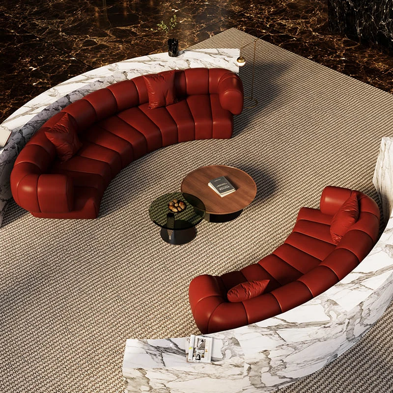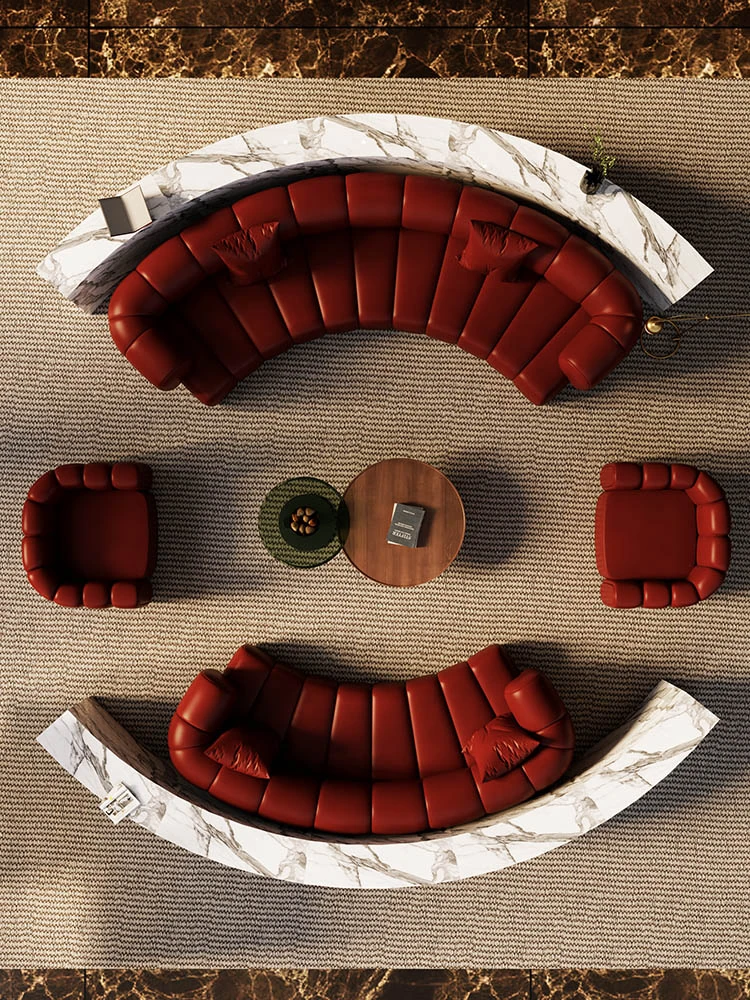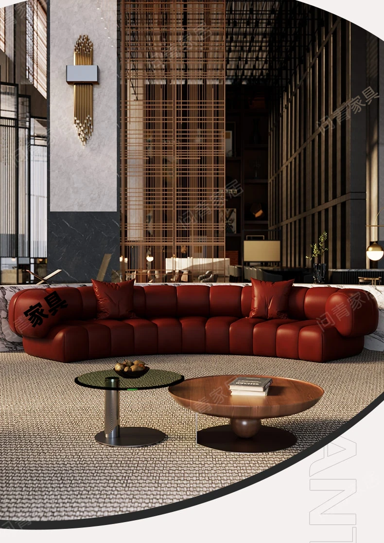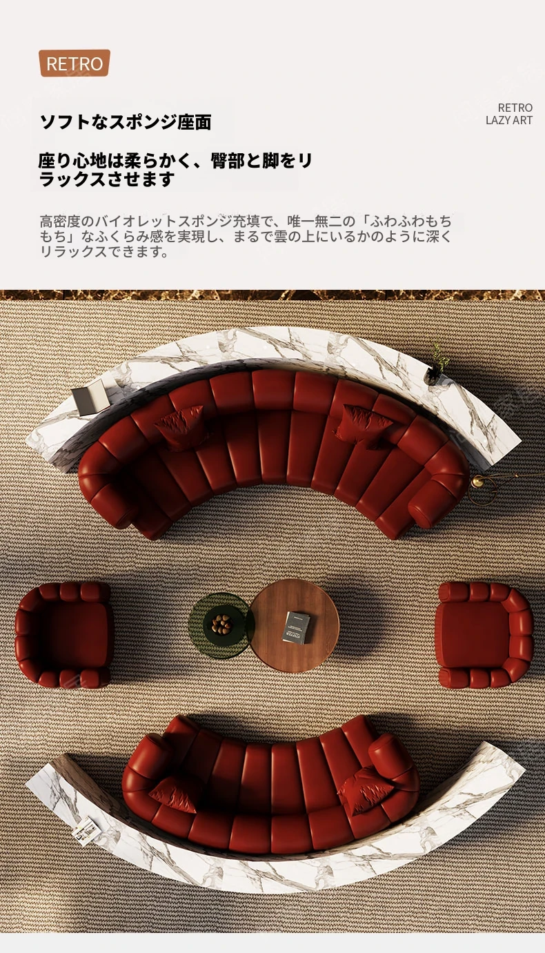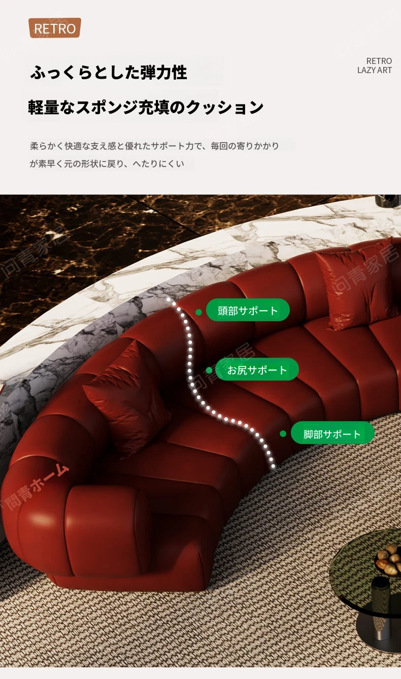 魅力的ハーフアーチソファー、ユニークなワインレッドカラー!オフィス、ショールーム、ホテルロビーに最適なリラックス空間を演出。お客様を魅了する接客エリアにぴったりです!