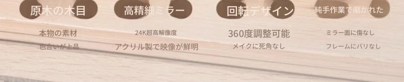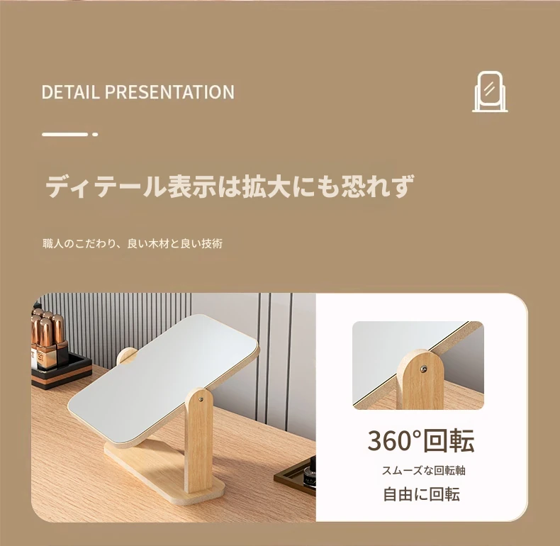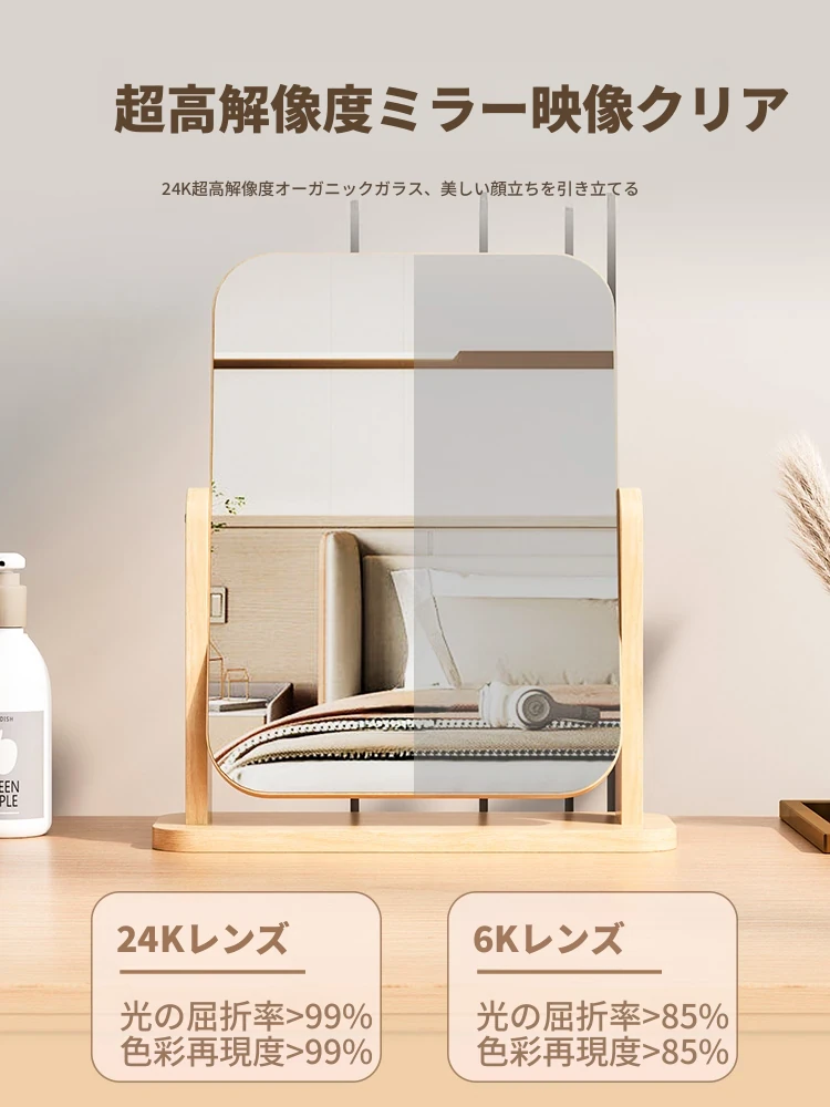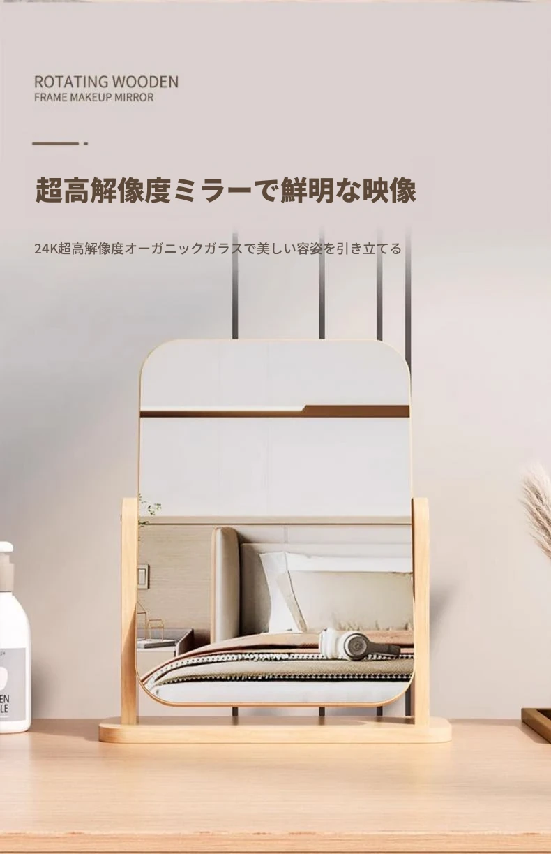 シンプルな木製要素の卓上化粧鏡 - 回転可能で便利!自宅や学生寮に最適な持ち運び可能なデスクトップメイクアップミラー。美しい仕上がりをサポートします!