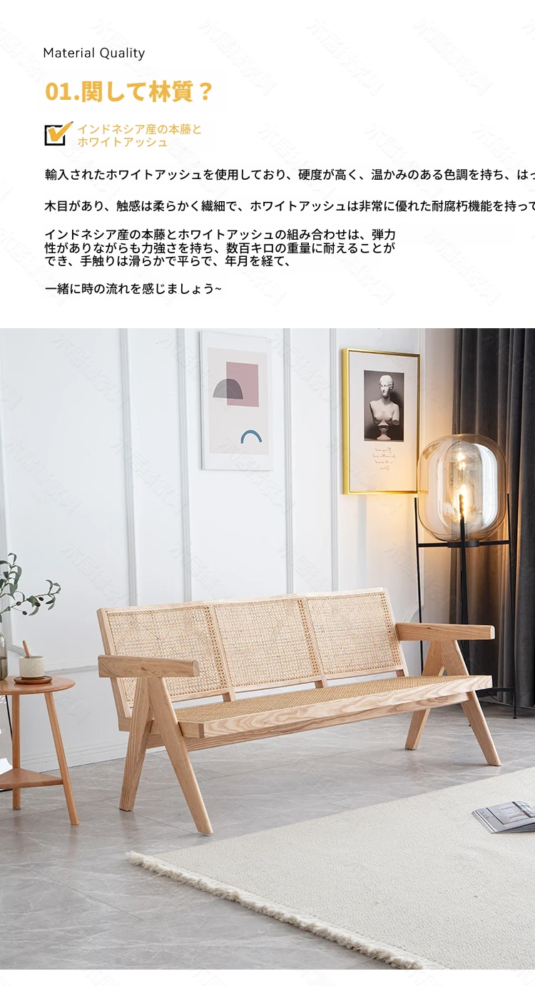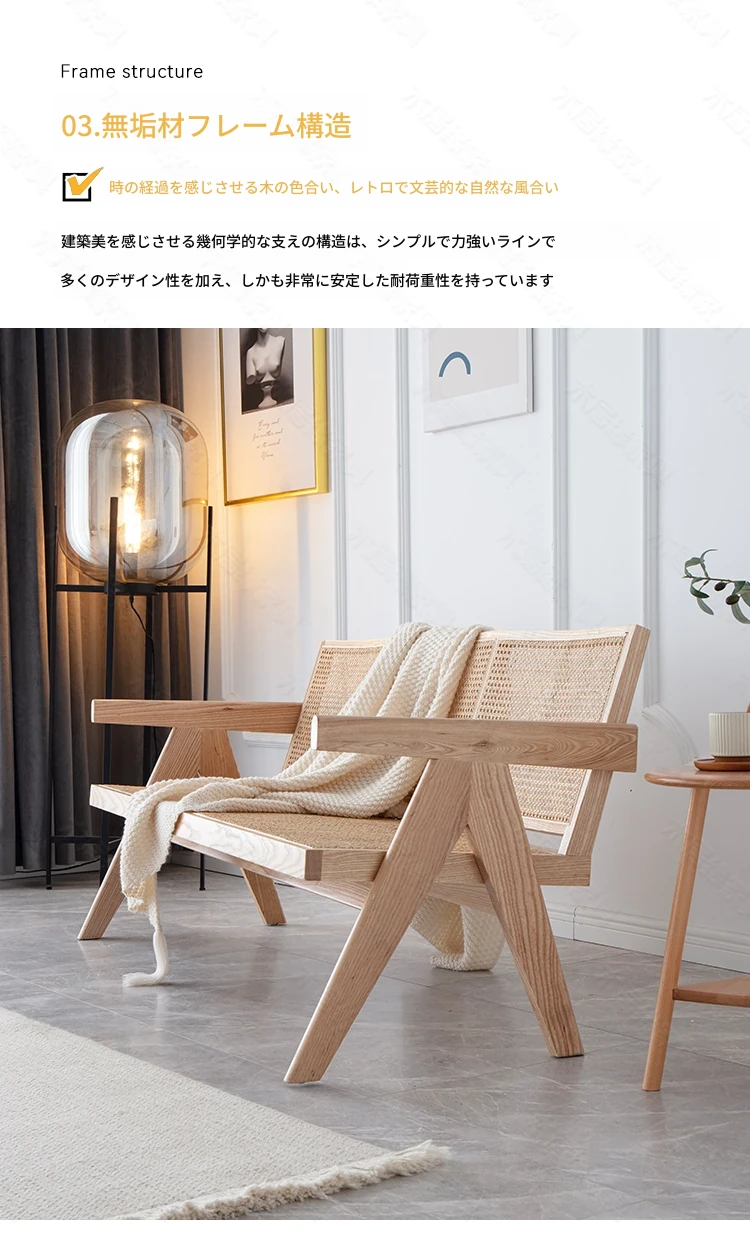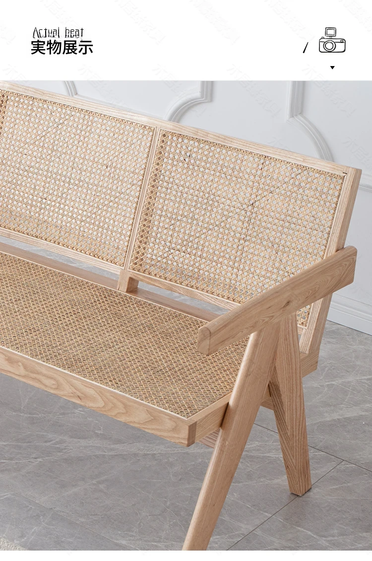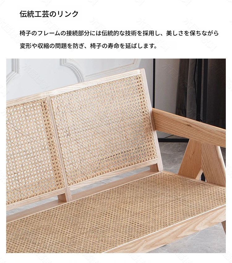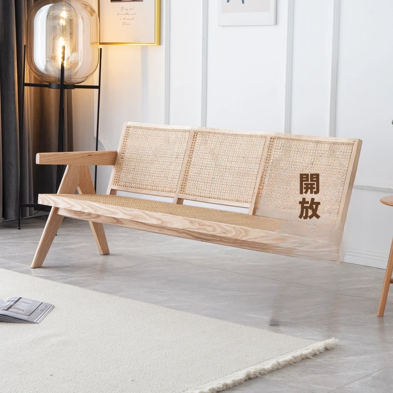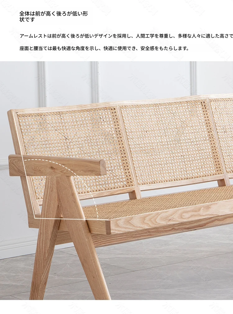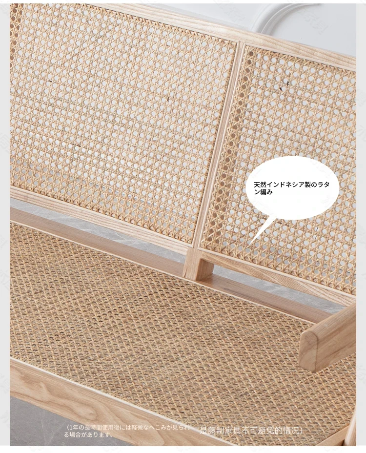 北欧スタイルの全木製ラタン編みソファチェア - コンパクトな3人掛け、冬夏両用、ホワイトアッシュ材使用。おしゃれで機能的な民宿家具に最適!