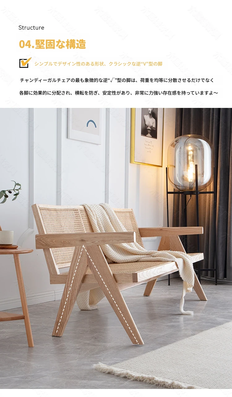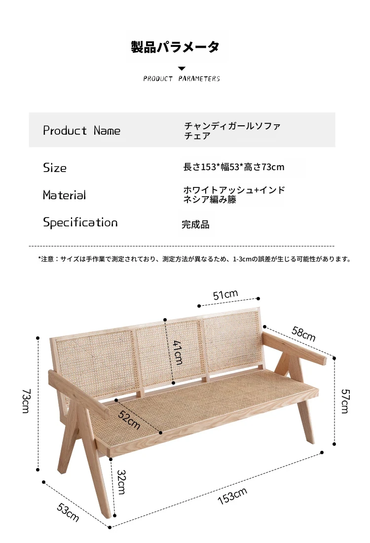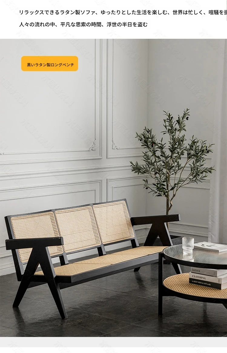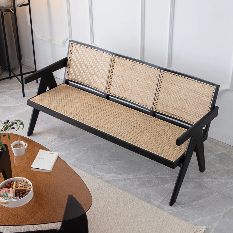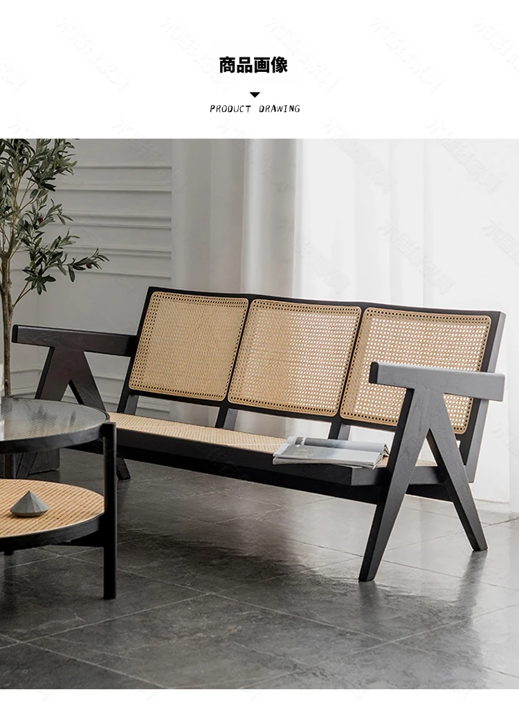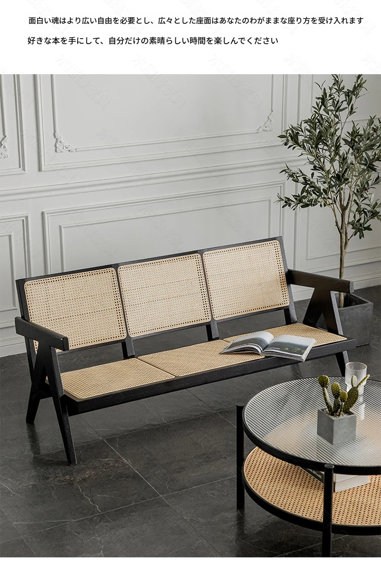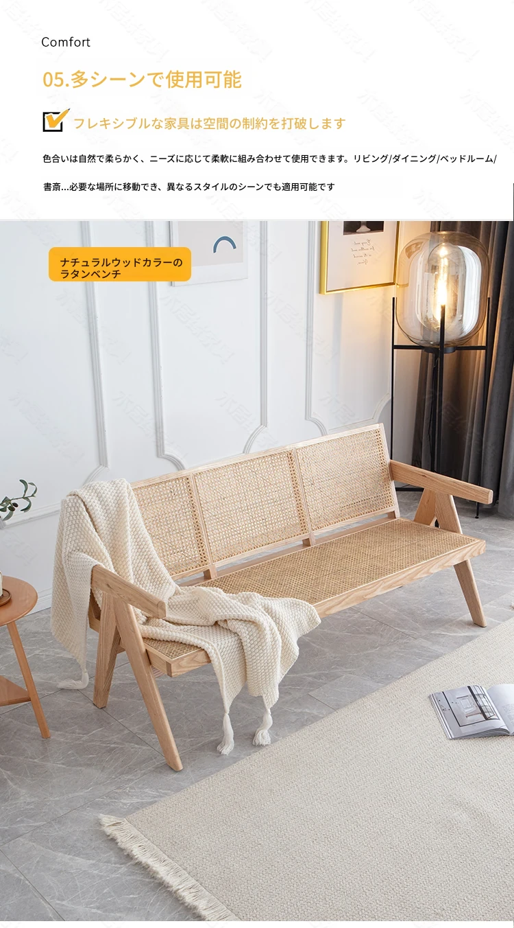 北欧スタイルの全木製ラタン編みソファチェア - コンパクトな3人掛け、冬夏両用、ホワイトアッシュ材使用。おしゃれで機能的な民宿家具に最適!