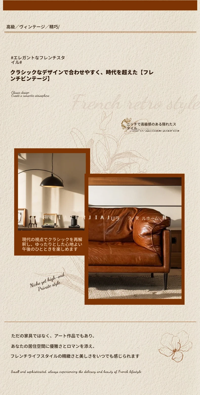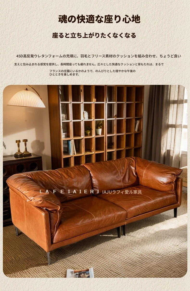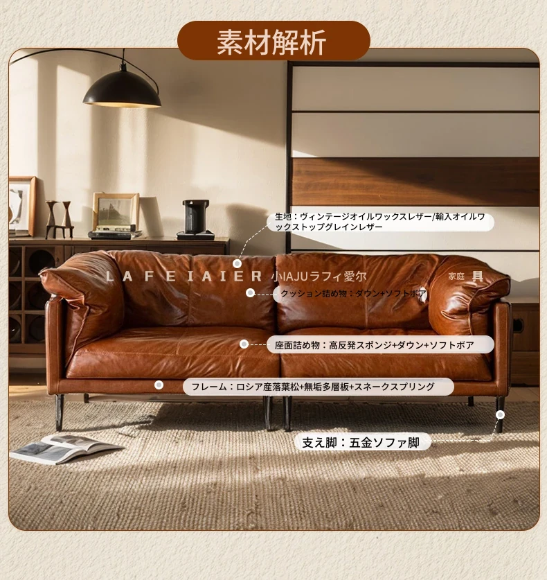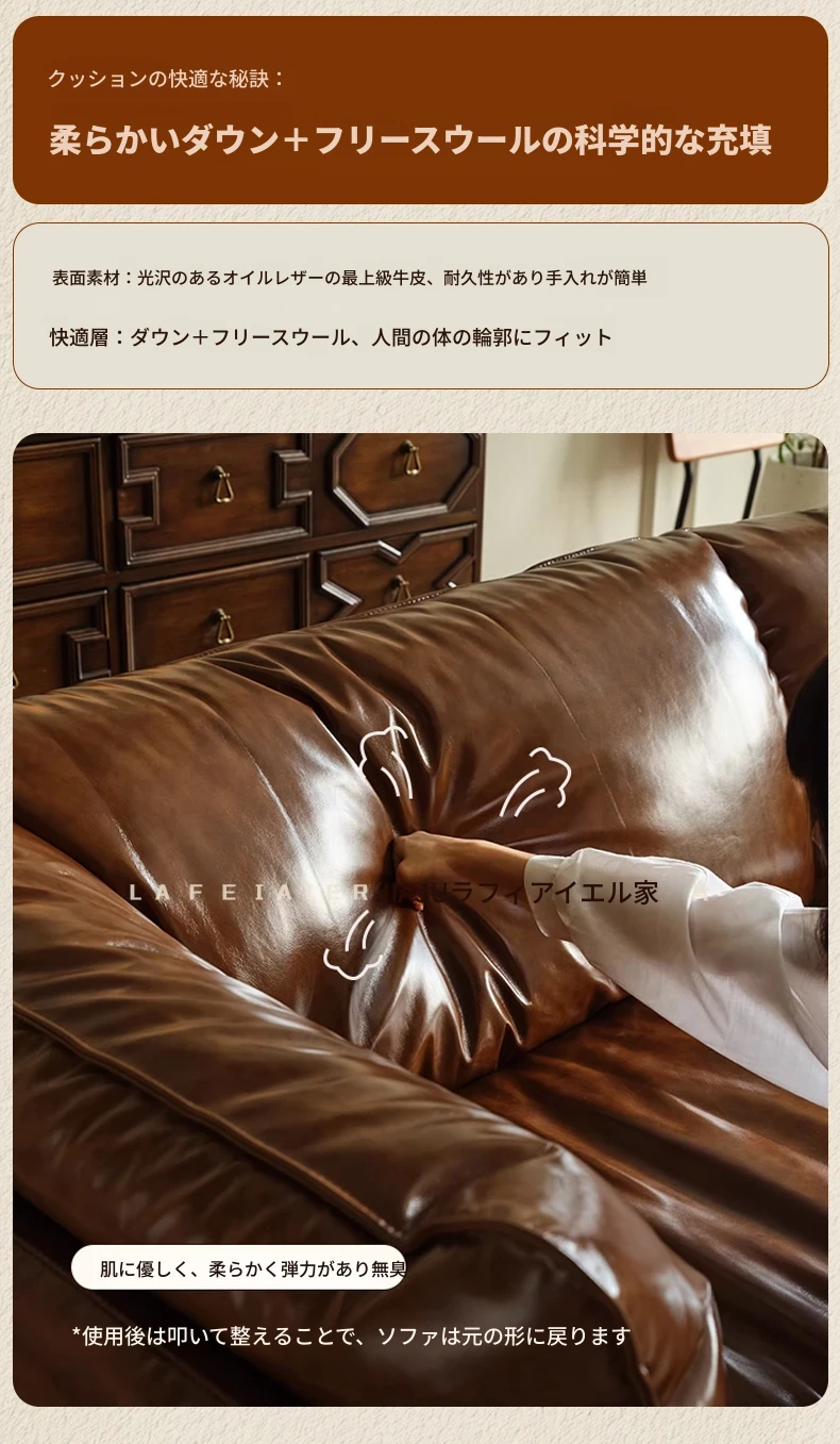 2025年新作!フランス風ヴィンテージダウンソファ 小型リビングに最適!オイルワックス本革使用のアンティークスタイルソファで、優雅な空間を演出。快適な座り心地をお楽しみください!