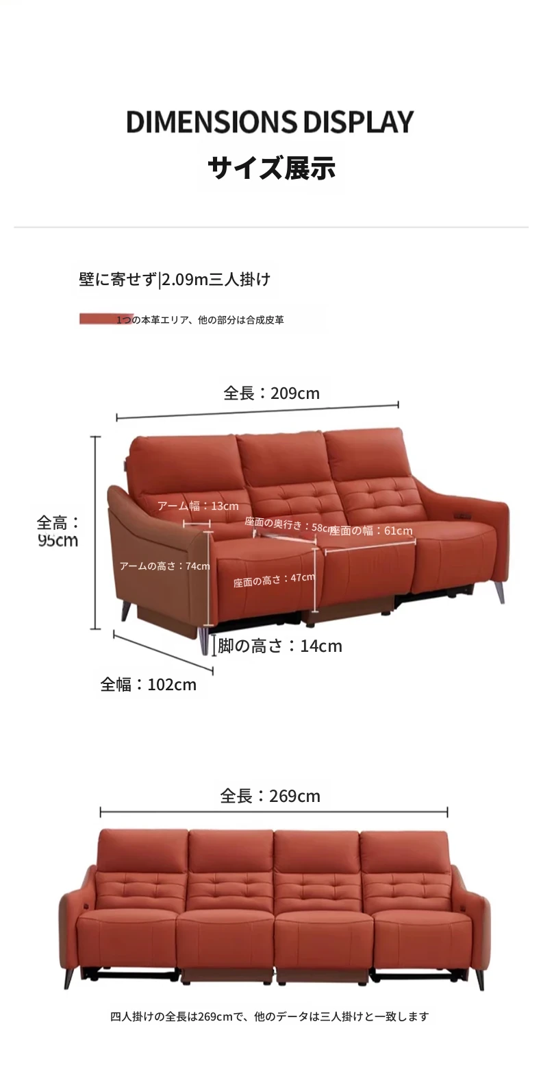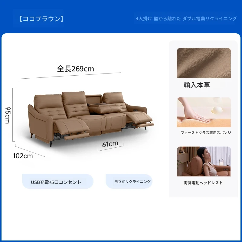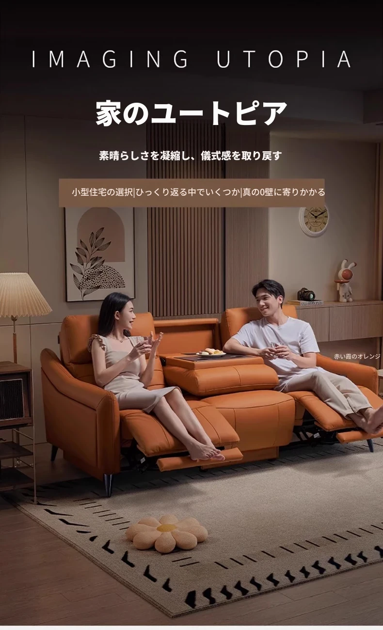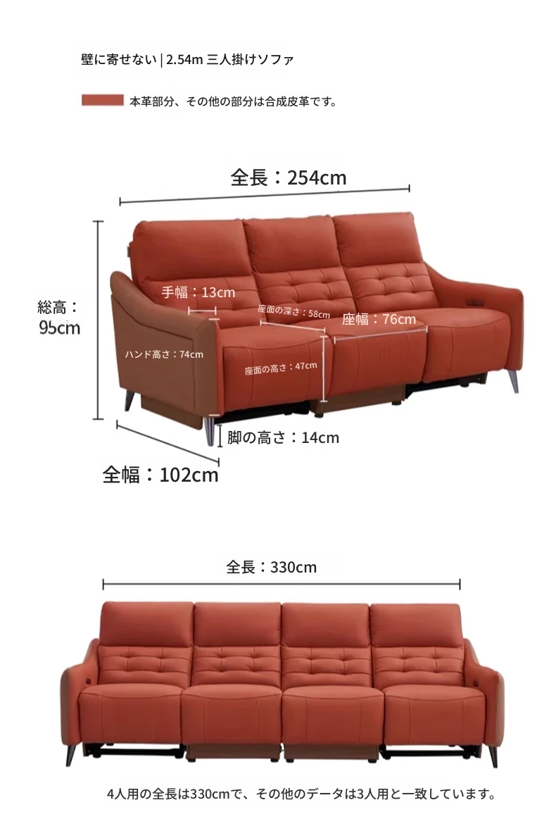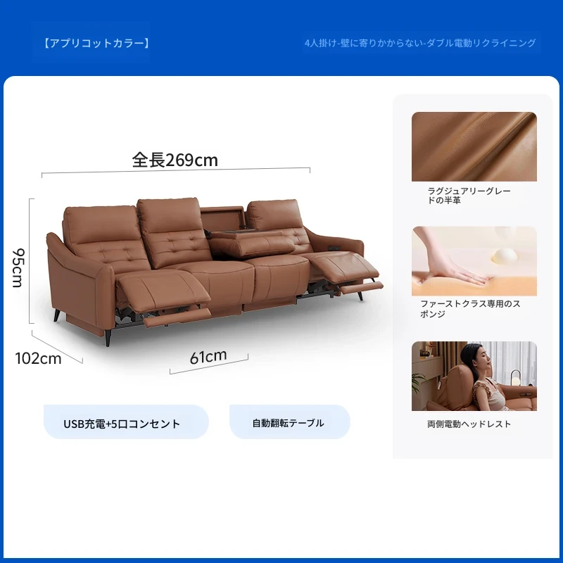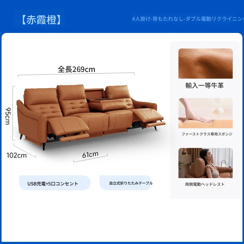 【2.69メートル 輸入フルグレインレザー】赤霞橙-4人掛け+リクライニングテーブル(2電動)