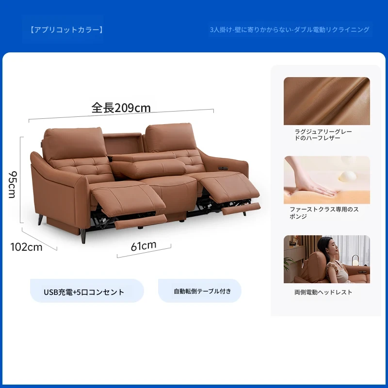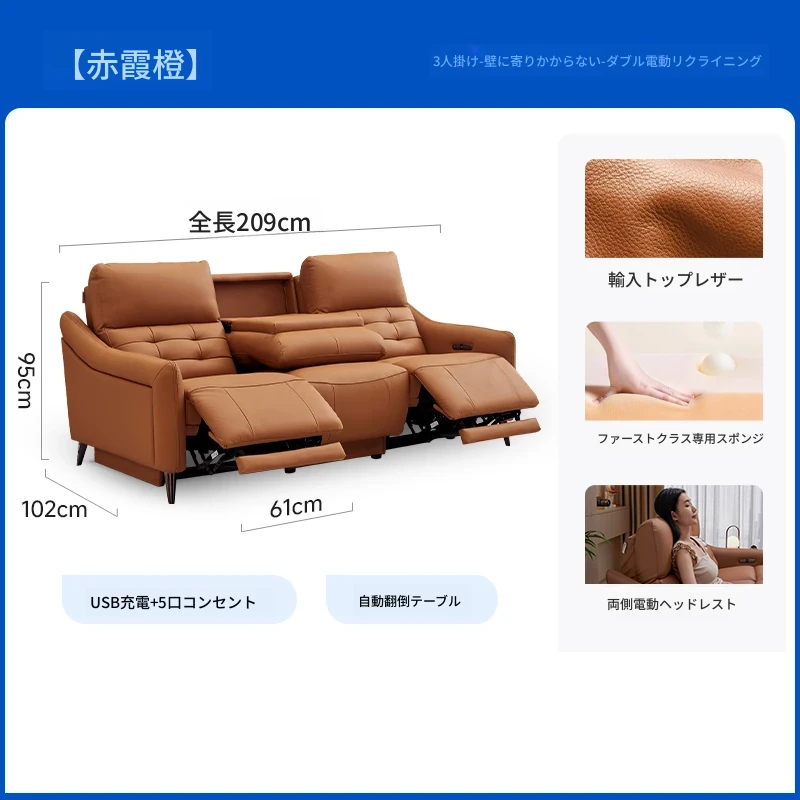 【2.09メートル 輸入フルグレインレザー】赤霞橙-3人掛け+リクライニングテーブル(2電動)