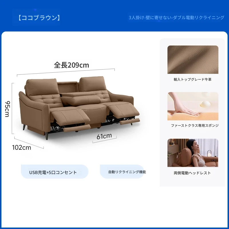 【2.09メートル 輸入フルグレインレザー】ココアブラウン-3人掛け+リクライニングテーブル(2電動)